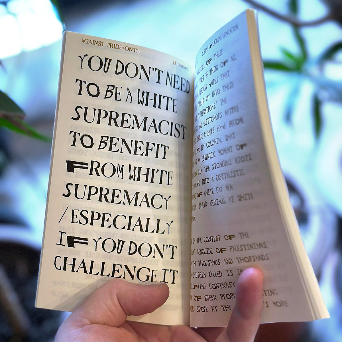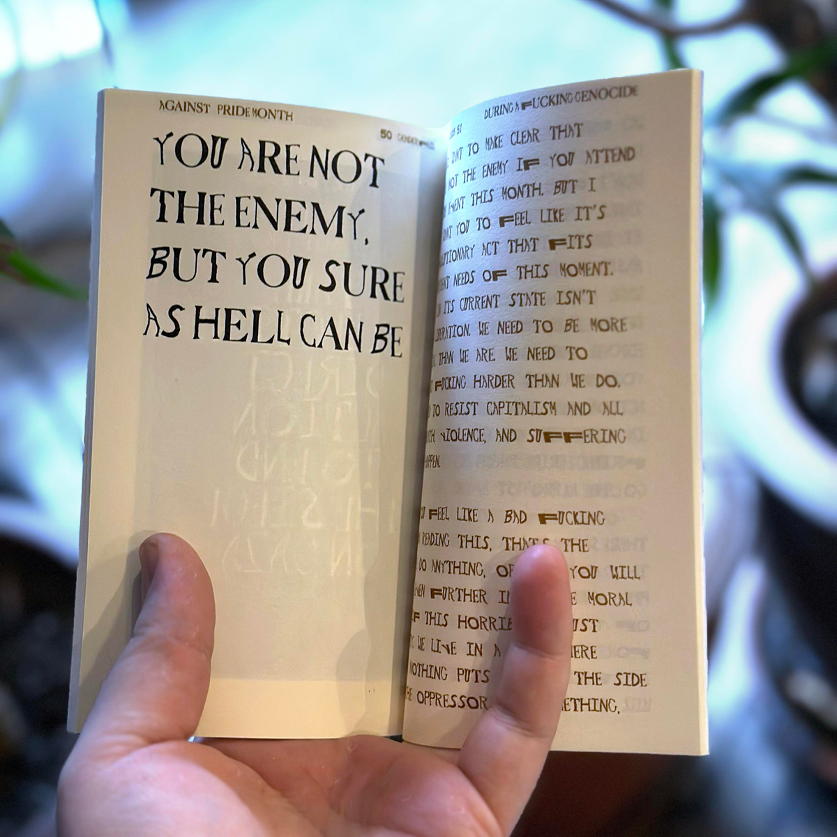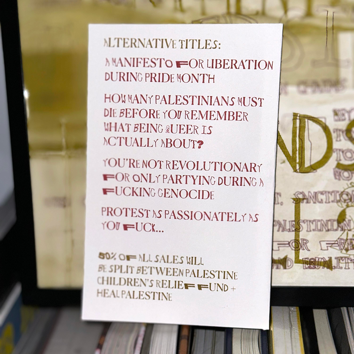 Against pride month during a fucking genocide Manifesto est un texte demandant à toutes les personnes queer + trans + non binaires pendant le mois de la fierté de manifester davantage que de faire la fête afin d'être solidaires avec les Palestiniens. Ce manifeste sera désordonné, imparfait, mais, espérons-le, profondément humain dans sa tentative de vous inspirer à vivre selon les idéaux que le mois de la fierté représentait à l'origine : une révolte contre l'injustice.