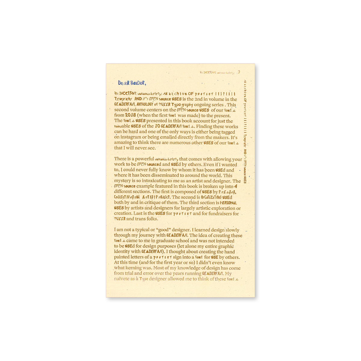 Le livre est le deuxième volume de la série en cours GenderFail, Anthology of Queer Typography. Il se concentre sur les utilisations open source des polices de caractères de Genderfail de 2018 (date de création de la première police) à aujourd'hui. Ce livre présente 26 utilisations open source uniques classées en quatre sections : personnelle, collective, institutionnelle et protestataire.