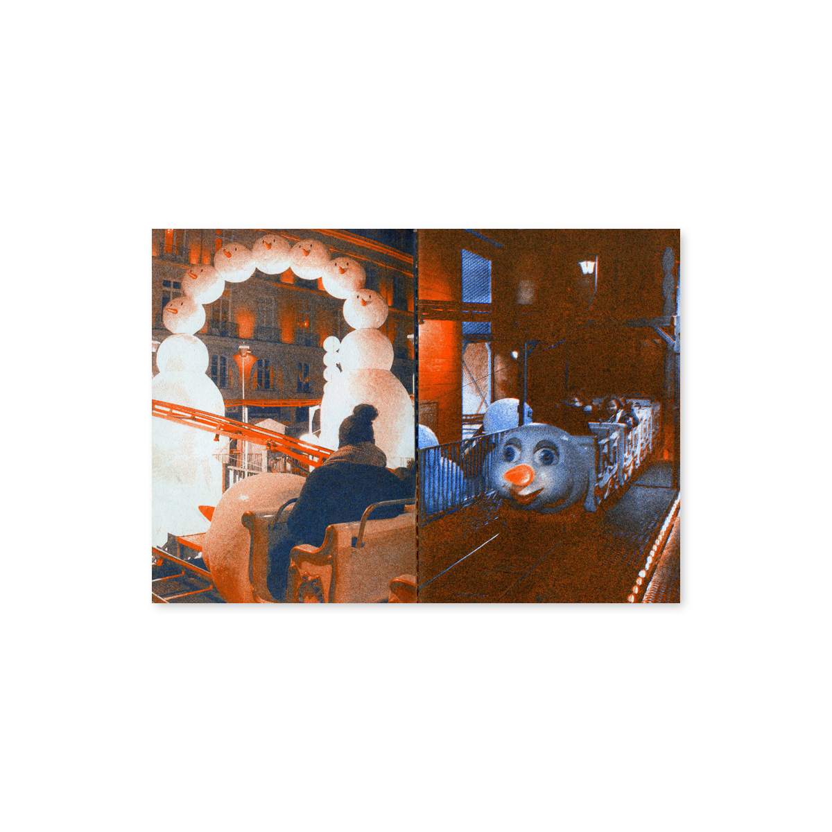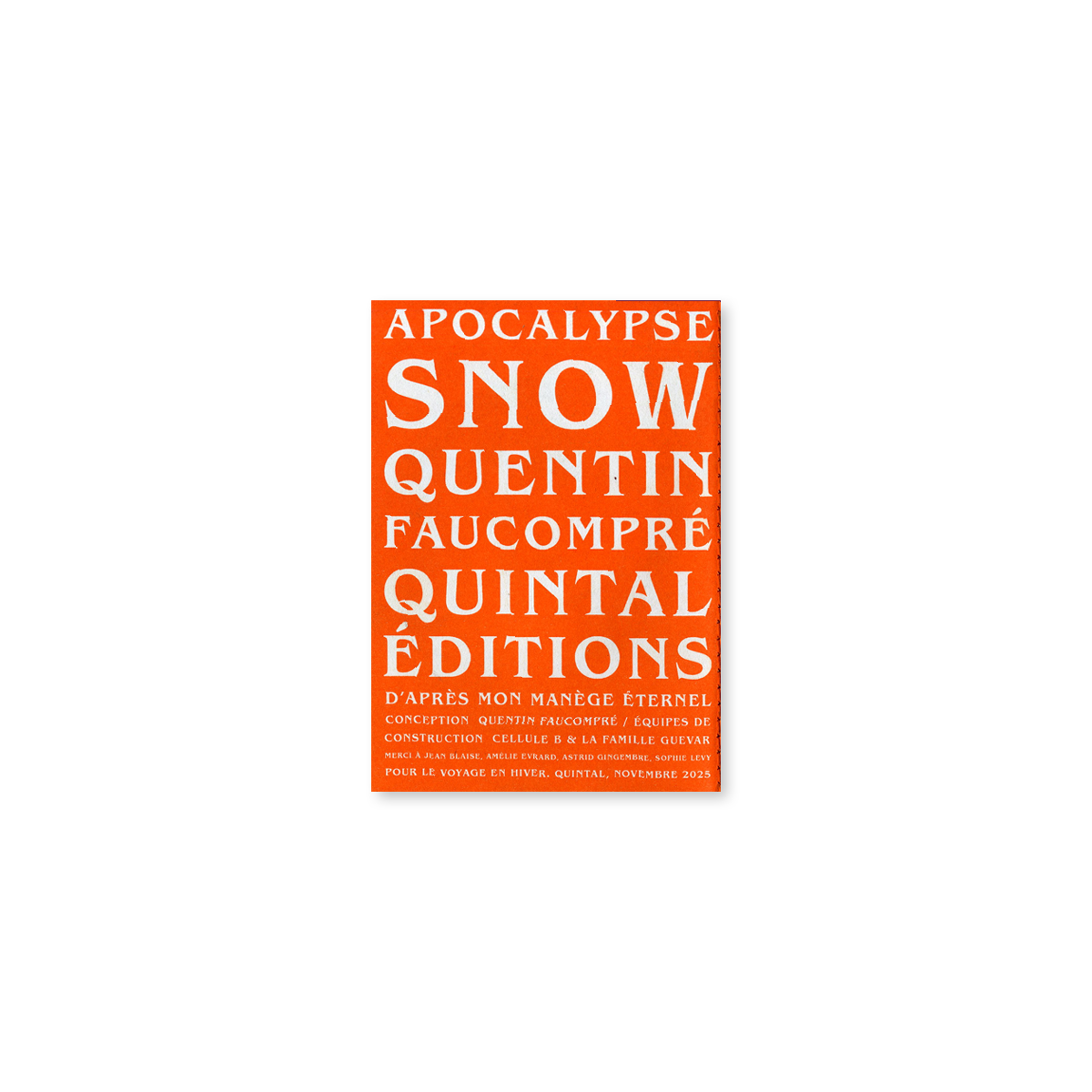 Apocalypse Snow est une série d'images issue du projet Mon Manège éternel conçu par Quentin Faucompré. Chenille des neiges, bonhommes de neige mutants, fusée-carotte, chalet mystérieux, monstre du Loch Ness des neiges, cabochons lumineux, artifices de fumée, Mon Manège éternel prolonge les codes de l'imagerie foraine à l'heure du dérèglement climatique. Le palindrome de Virgile repris par Guy Debord hante le mini grand huit : In girum imus nocte et consumimur igni ("nous tournons dans la nuit et nous sommes consumés par le feu"). Méliès est en embuscade.