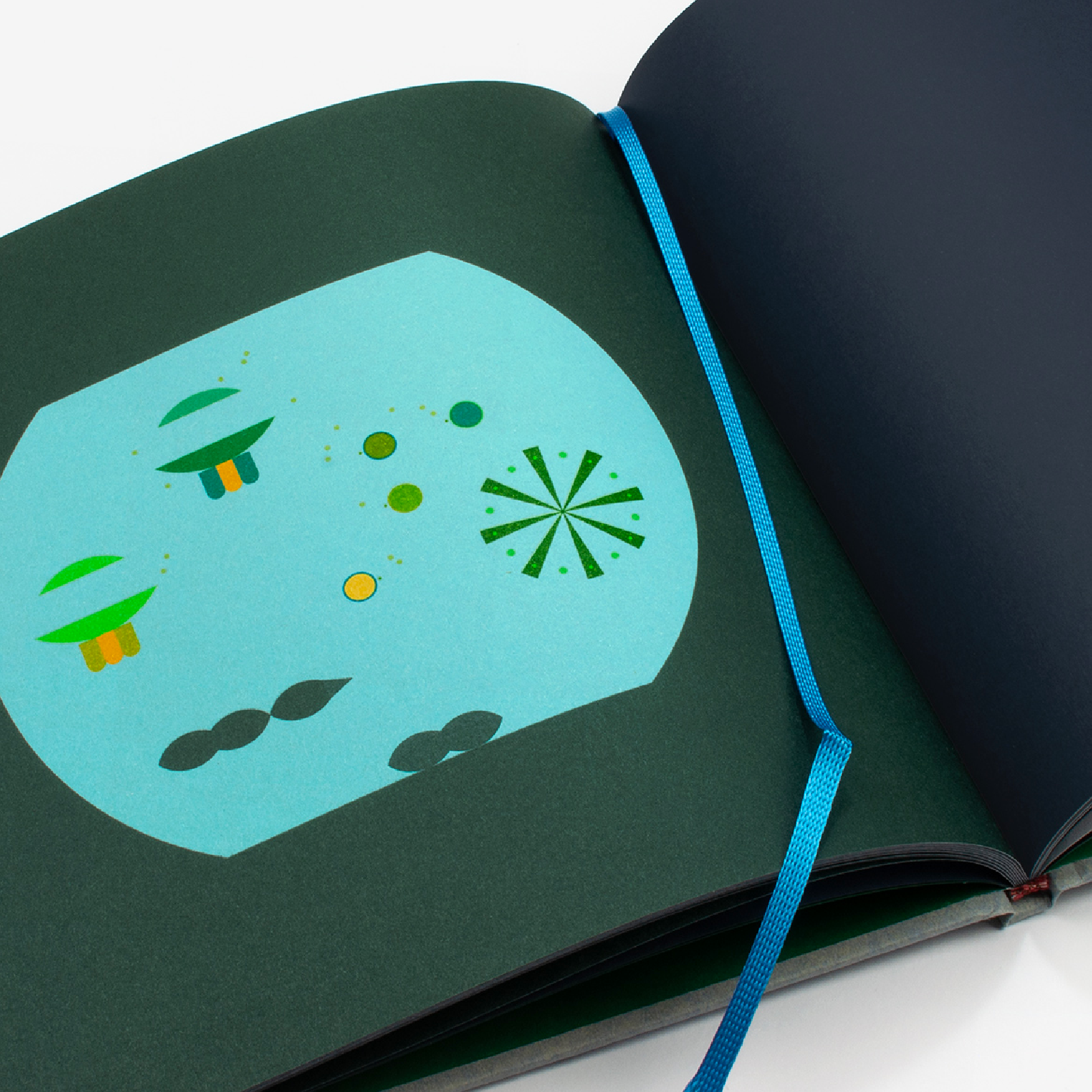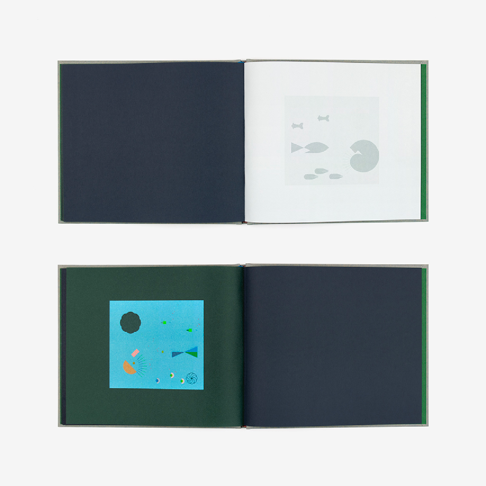 Aquarium nous invite à une promenade magique parmi 12 bassins parsemés d’espèces graphiques insolites. Sur chaque page, on perçoit d’abord de discrètes silhouettes animales. Au verso, un ensemble de figures géométriques colorées. Face à la lumière, formes et couleurs fusionnent à travers le papier translucide et immergent notre regard dans un jeu d’apparition captivant. En un mouvement de page, les compositions abstraites deviennent un véritable théâtre aquatique.