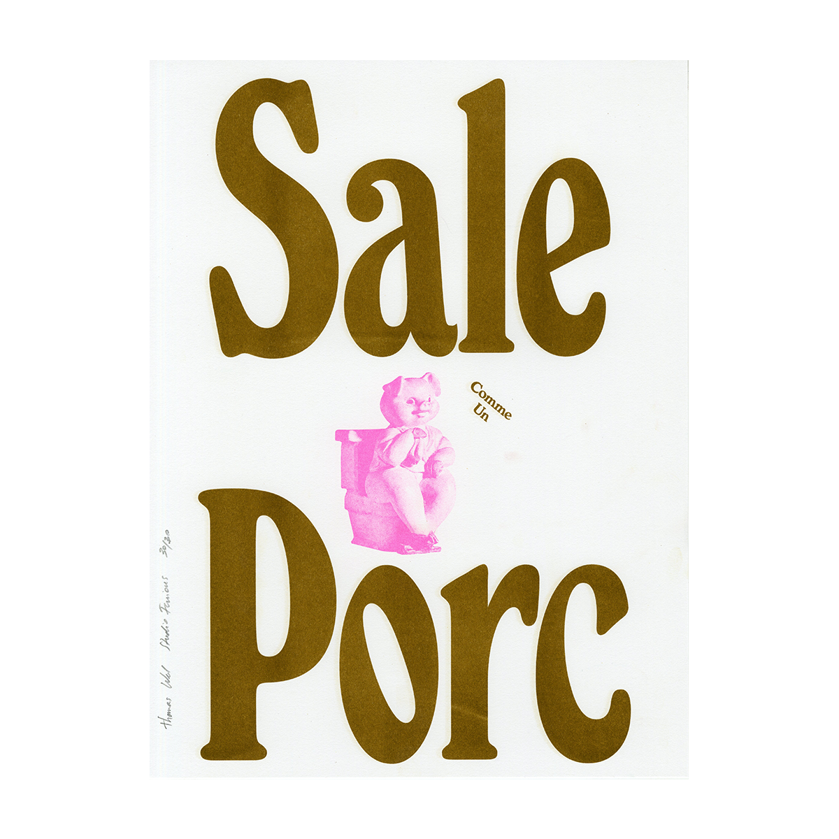 Tirage en risographie tiré du livre 'Pig Big' auto édité par Thomas Weil en hommage à son père, collectionneur de cochons. L'ouvrage, truffé de photographies et de textes, s'amuse à décortiquer l'étrange obsession de la figure paternelle pour cet animal grassouillet à la sale réputation.