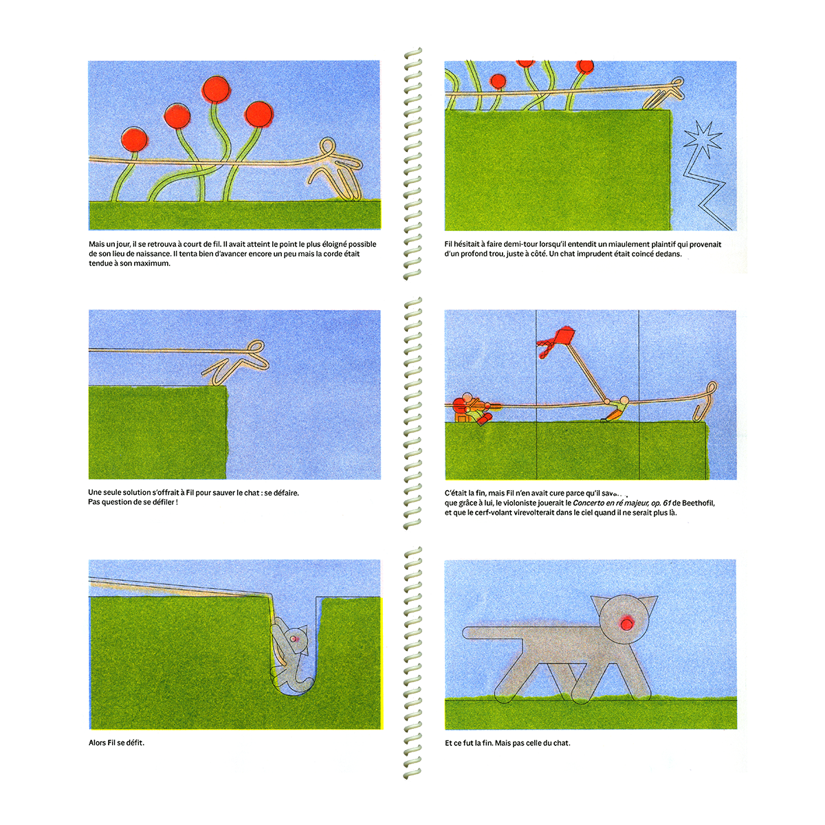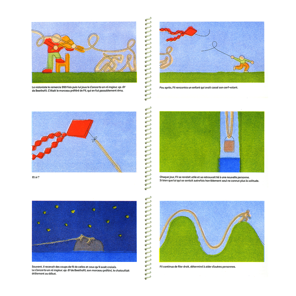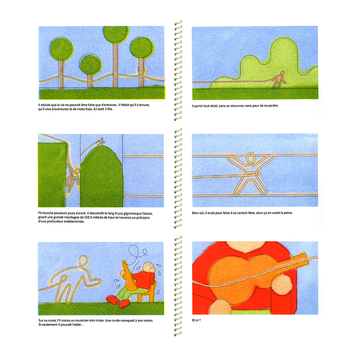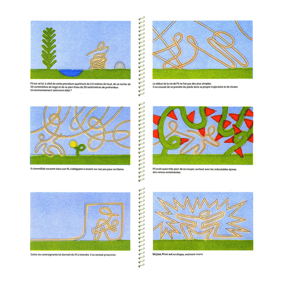 Relié à son point de naissance par son fil, Fil ne cesse de se prendre les pieds dedans, ce qui le rend malheureux. Un jour il décide de filer droit vers l'aventure.