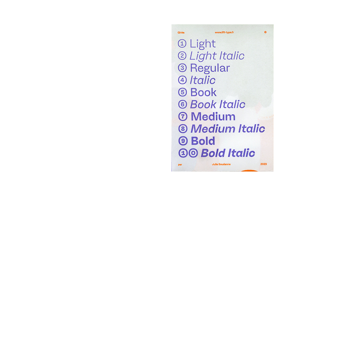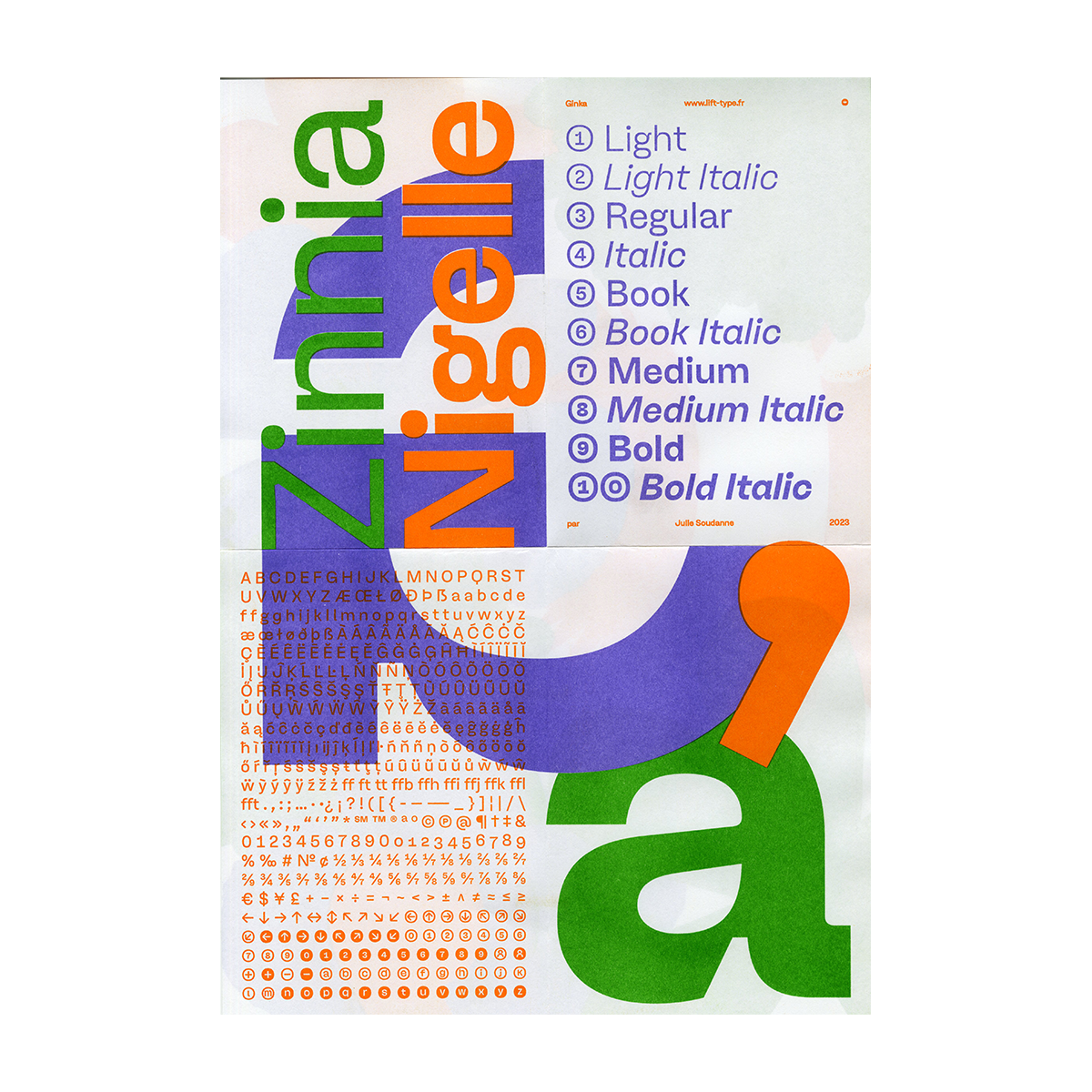Spécimen Typographique de Julie Soudanne , mise en page avec Alice Dhinaut de son caractère 'Ginka' créé en 2023. Disponible chez Lift Type.