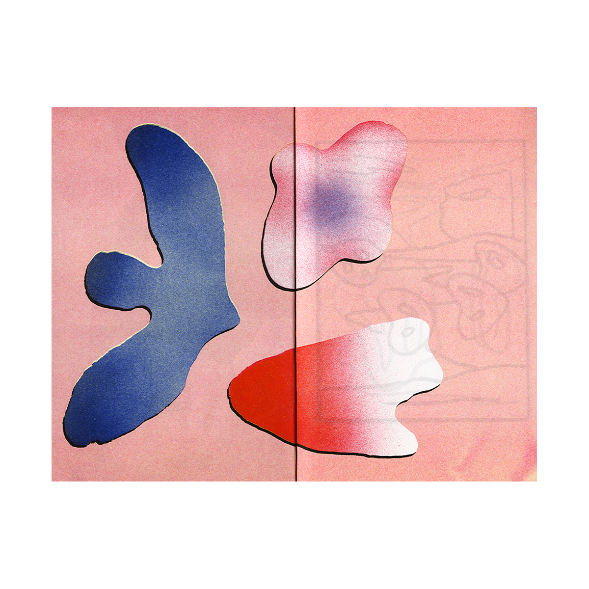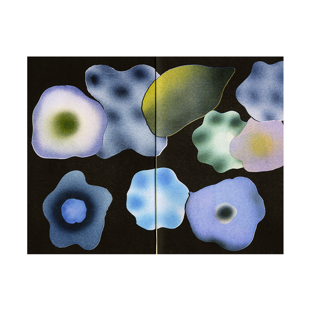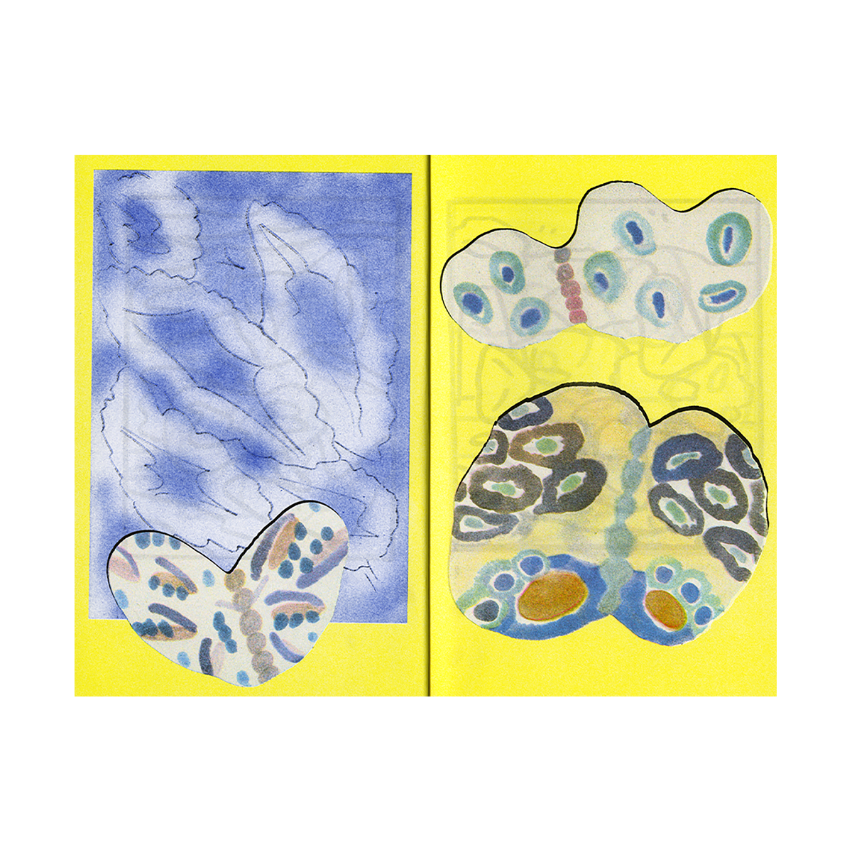 Printemps blanc est un livre de fleurs et de papillons. Les motifs du printemps s’y confondent, les insectes revêtent les paysages fleuris. Mis en page à la manière d’un herbier, les pages sont composées selon des rythmes différents. On alterne entre des planches saturées de couleurs et de motifs avec des planches sur fond noir, où un amas de fleurs semblent attendre d’être triées à leur tour. Ces planches d’herbier sont entrecoupées de doubles pages de dessins où l’on suit un, ou plusieurs papillons, dans des paysages blancs dessinés au trait. Les papillons et les fleurs ont été réalisés en plâtre, ce sont de fines surfaces planes, elles font écho par la fragilité du matériau aux fleurs séchées ou aux papillons des herbiers.