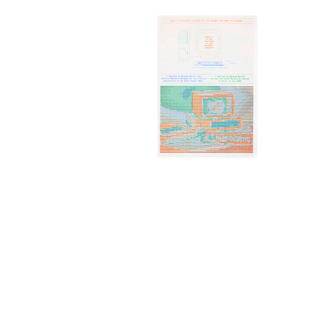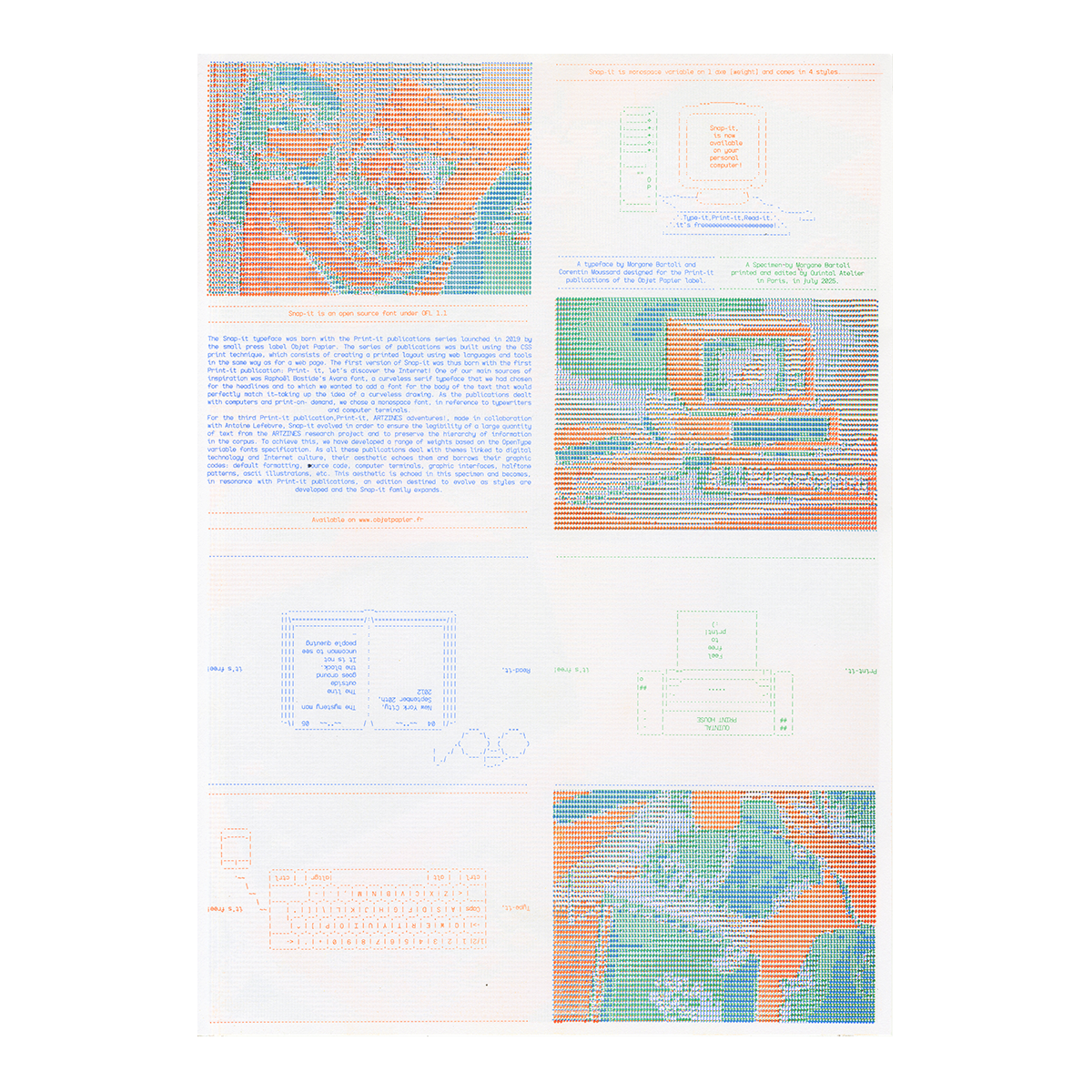 Pour la nouvelle publication Print-it, l’aventure ARTZINES ! réalisée en collaboration avec Antoine Lefebvre, la Snap-it évolue dans le but d’assurer la lisibilité d’une grande quantité de texte issue du projet de recherche ARTZINES. Elle se décline à travers une variation de graisses basées sur la spécification de polices variables OpenType variable fonts. Variable sur l’axe de la graisse, elle se décline en 4 styles.