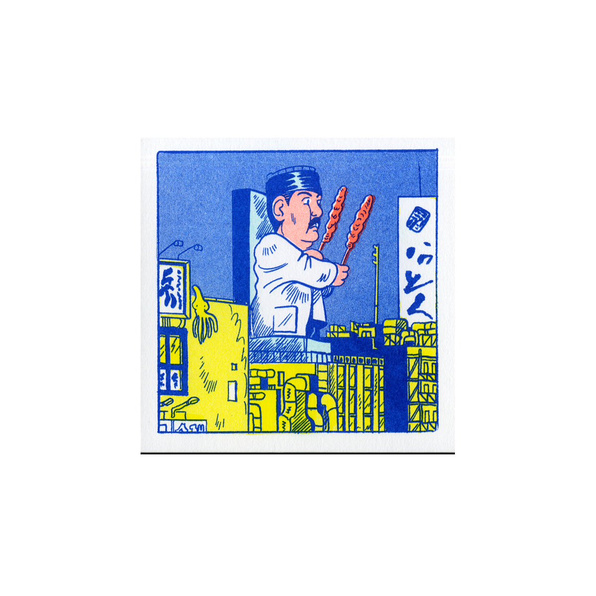 Illustration issue du recueil de dessins éponyme d'un voyage entre Tokyo et Naoshima de l'artiste Simon Bournel-Bosson. Imprimée en Risographie 4 couleurs.