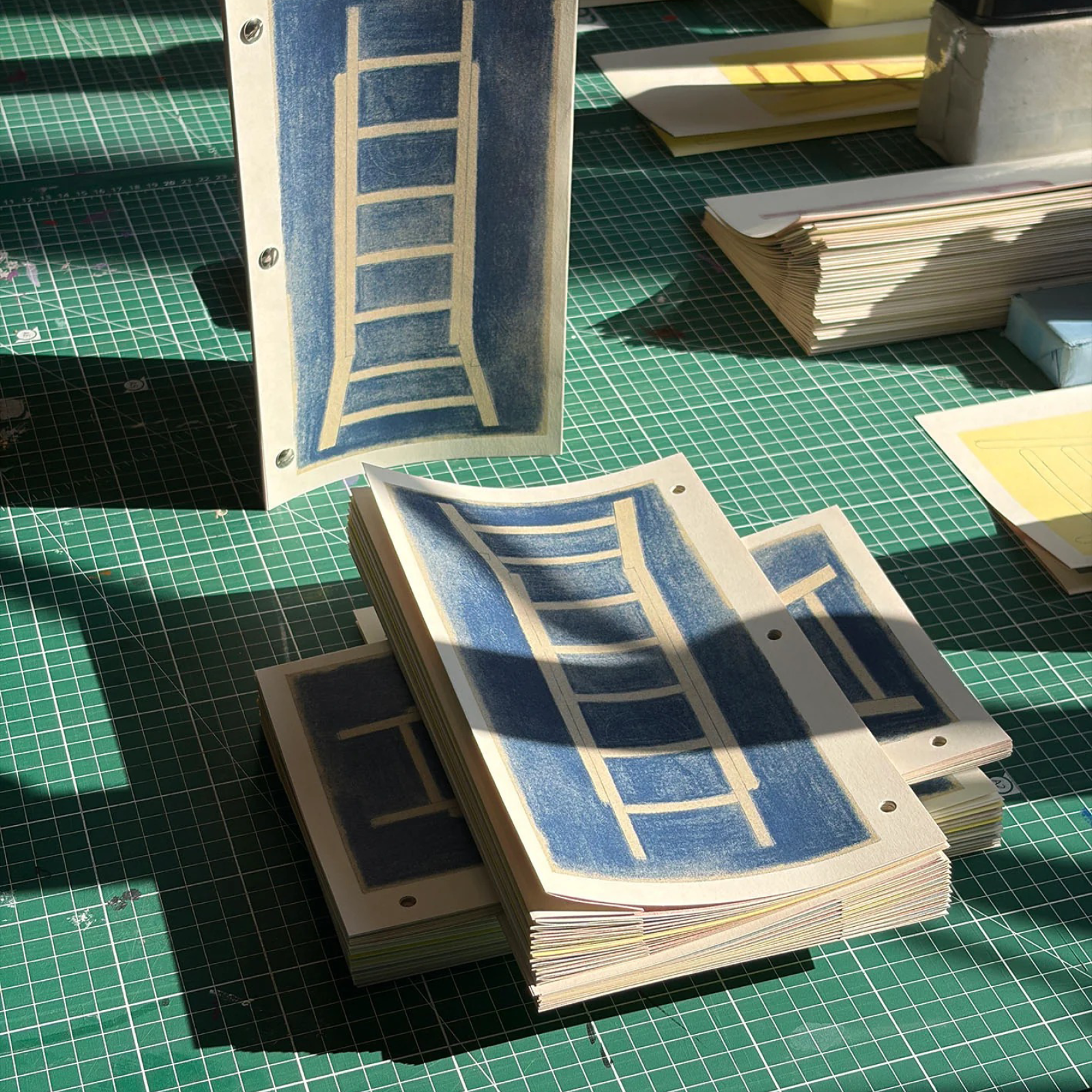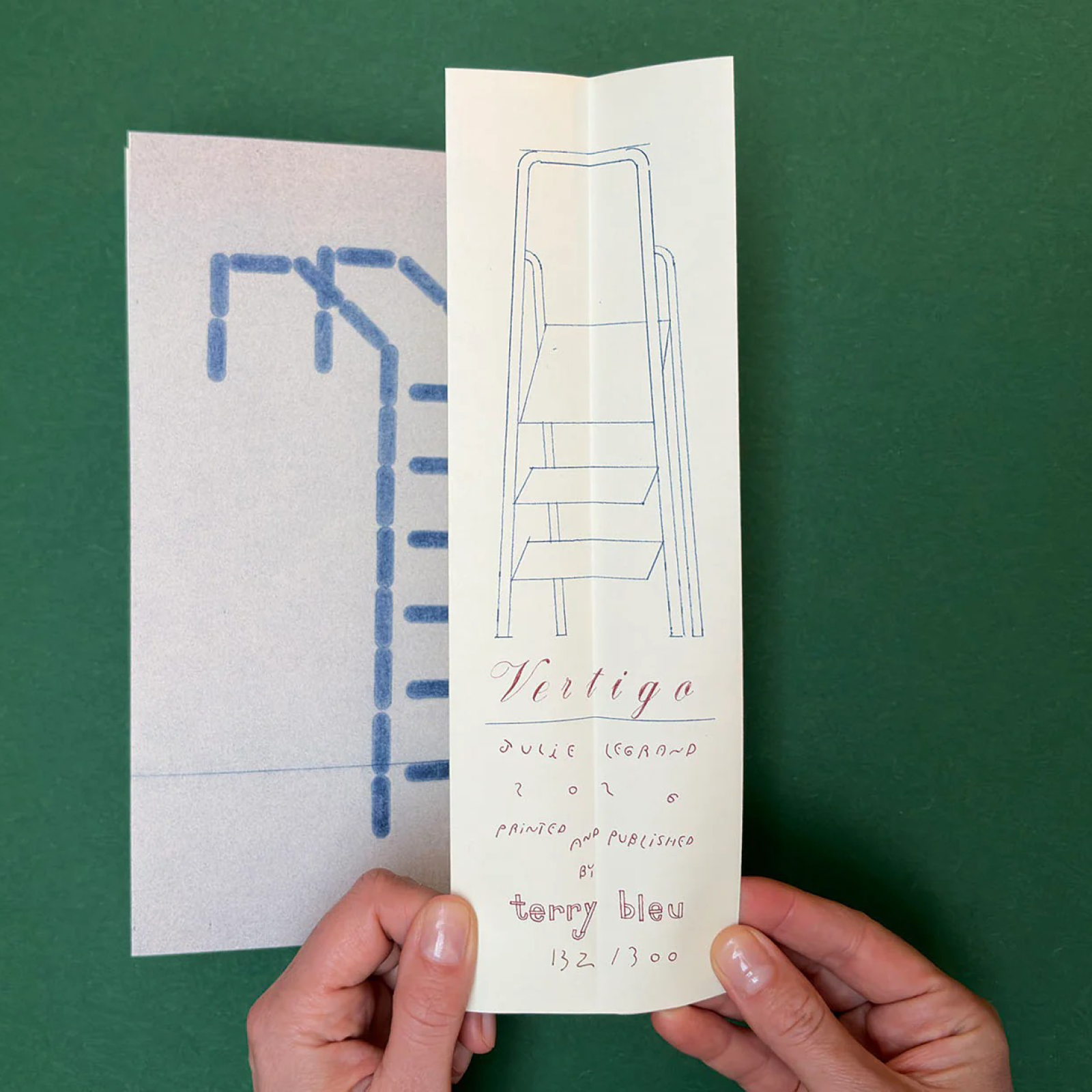 Vertigo présente, sous forme d’inventaire, une série de dessins d’échelles différentes. Dessinées à la règle, elles se répètent comme des variations d’un même motif. Julie explore leurs formes et leur sens : ce sont des objets qui permettent de monter, mais qui font aussi penser à la chute. Entre ordre et obsession, Vertigo montre la fragilité du regard face à la hauteur, et transforme la répétition en une manière calme et paradoxale d’apprivoiser le vertige.