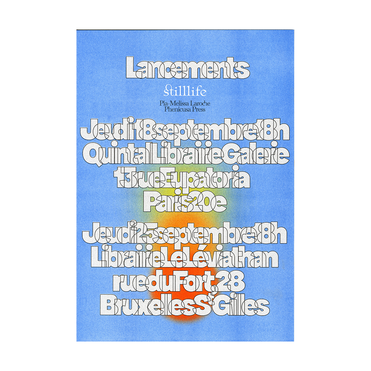 Affiche des lancements du livre Stilllife, un livre crépuscule, édité par Phenicusa Press, imprimé par Quintal et lauréat de la bourse Fanzine de l'ADAGP