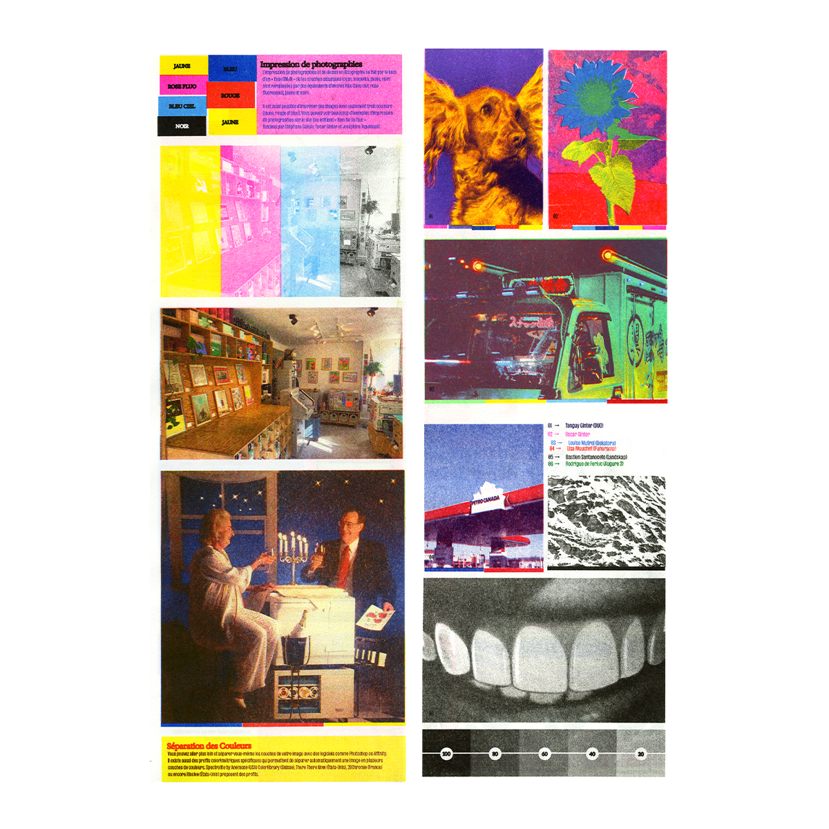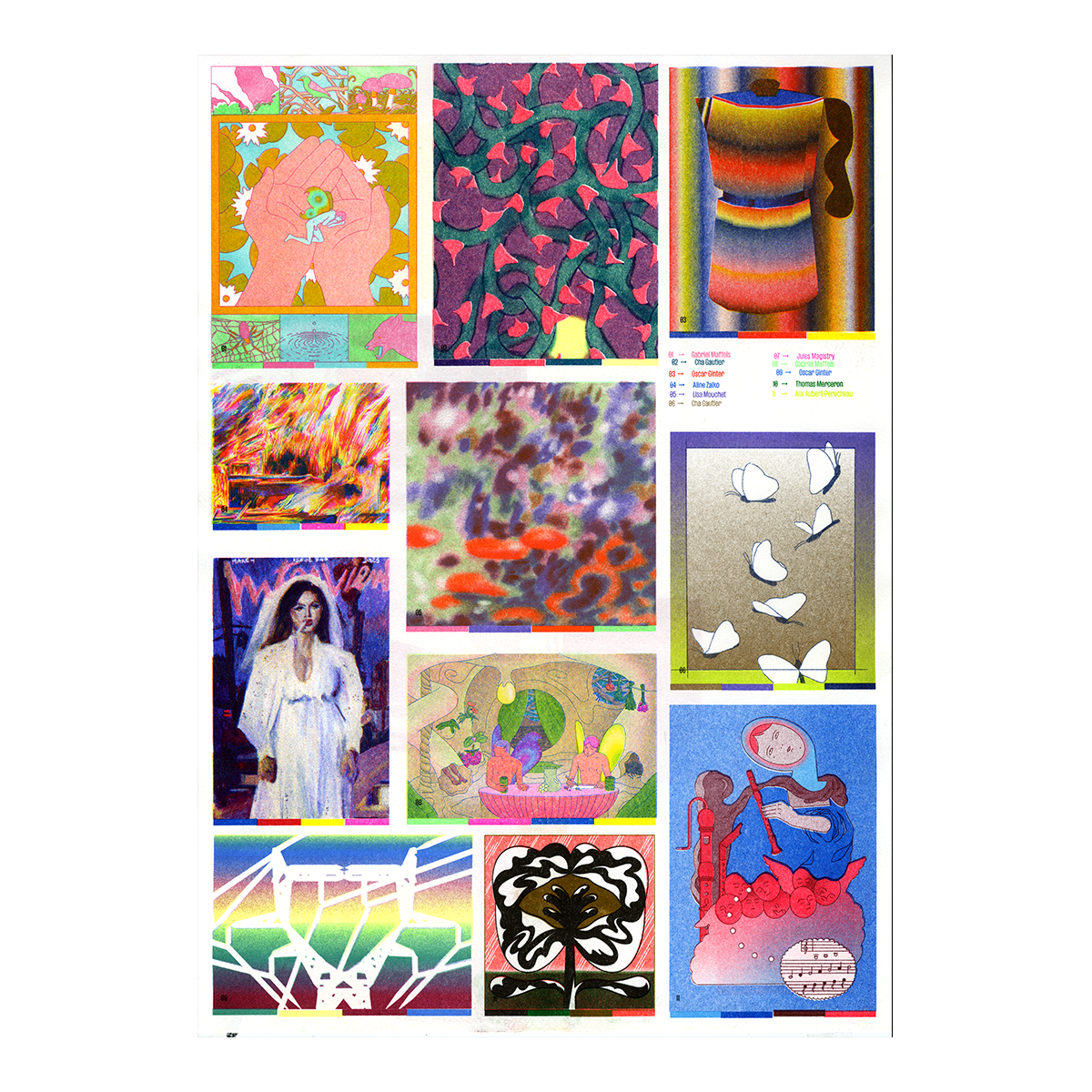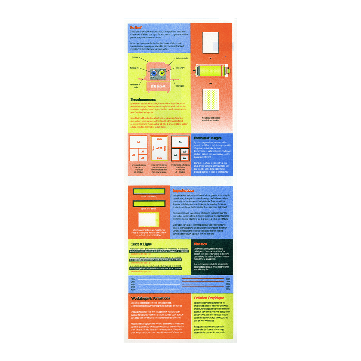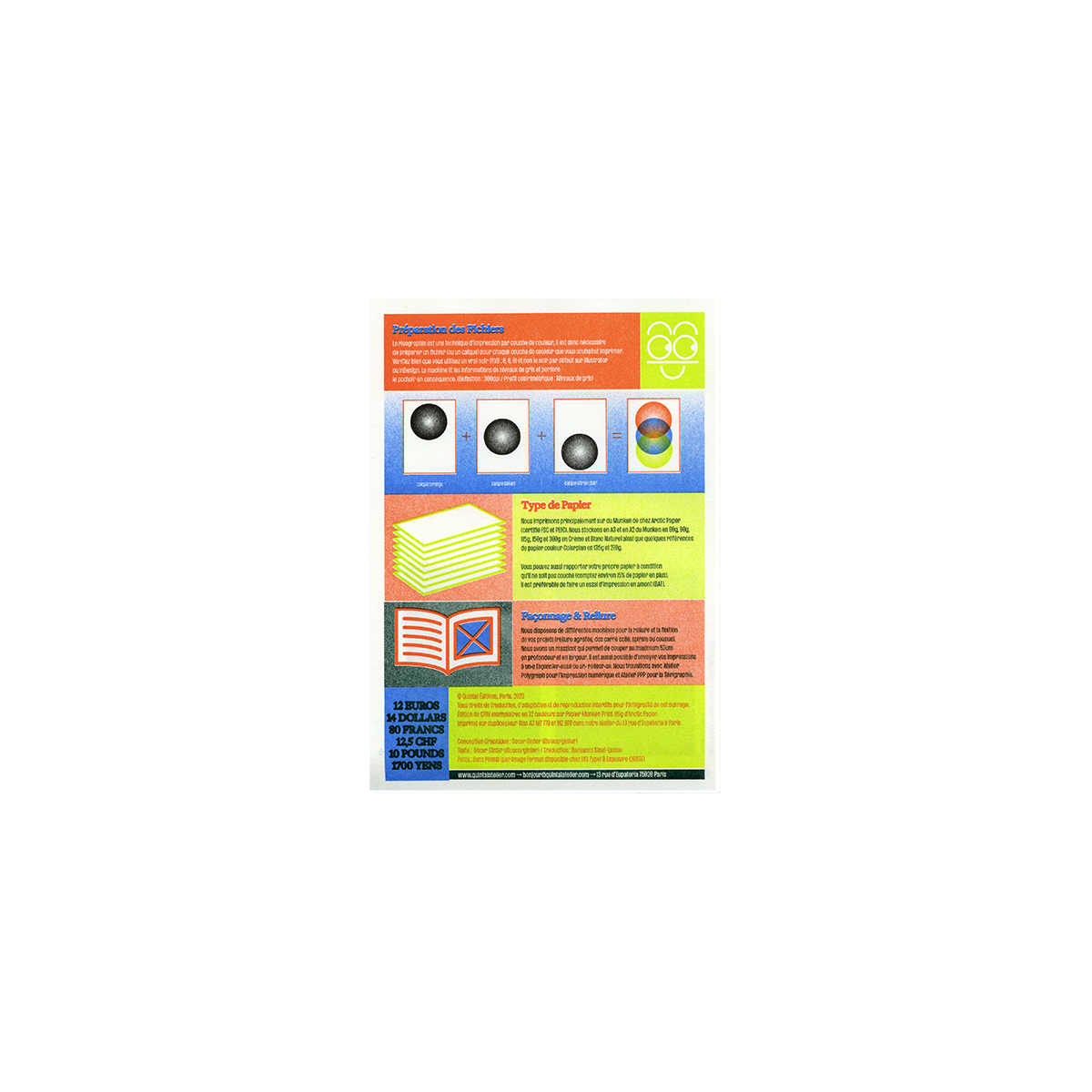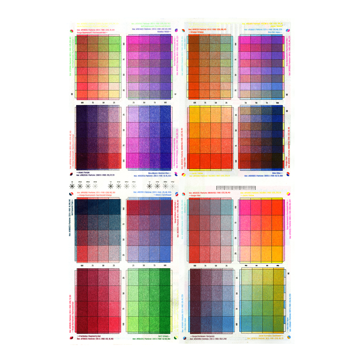 Un guide sur l’impression en risographie par Oscar Ginter. Deux feuilles A3 imprimées avec 67 passages de couleurs présentant les possibilités de la technique d’impression et de l’atelier Quintal.