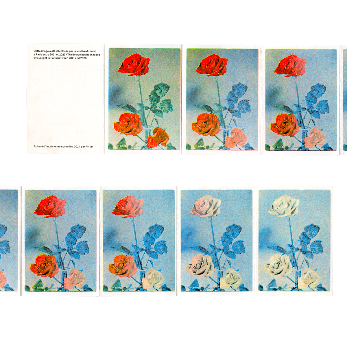 Pendant deux années entre 2021 et 2023, l'artiste Charles Villa a exposé cette carte postale à la lumière du soleil, collée à la vitre de son atelier. Elle a été numérisée à différentes étapes de sa dégradation jusqu’au bleuissement total.
