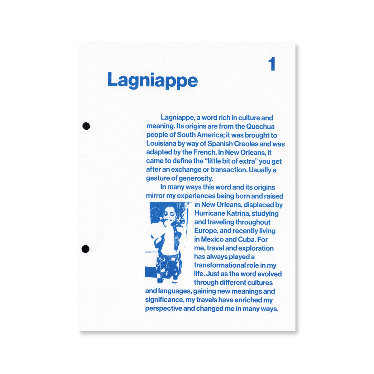 Lagniappe est un livre-affiche qui emmène les lecteurs dans un voyage transformateur à travers des illustrations, des textes et de la poésie. Son titre, qui signifie « un petit supplément », reflète la richesse des influences culturelles et l’esprit qui imprègnent ses pages, imprimées à 100 % en risographie.