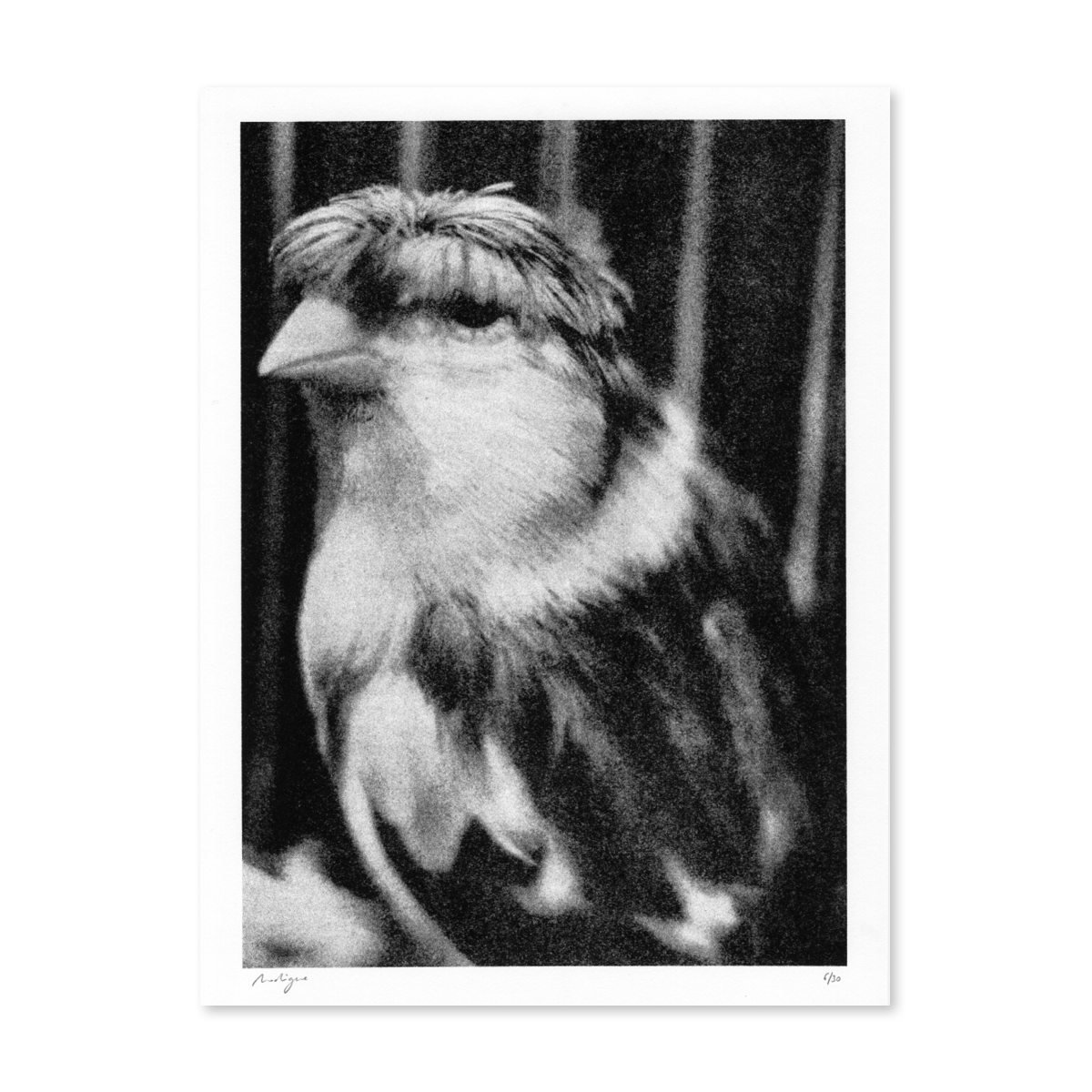 Tirage 30x40cm extrait de la série Augure de Rodrigue de Ferluc, impression Riso en monochrome sur papier 100% coton Cocaïne 250g, édité par les Éditions Rien Ne Va Plus