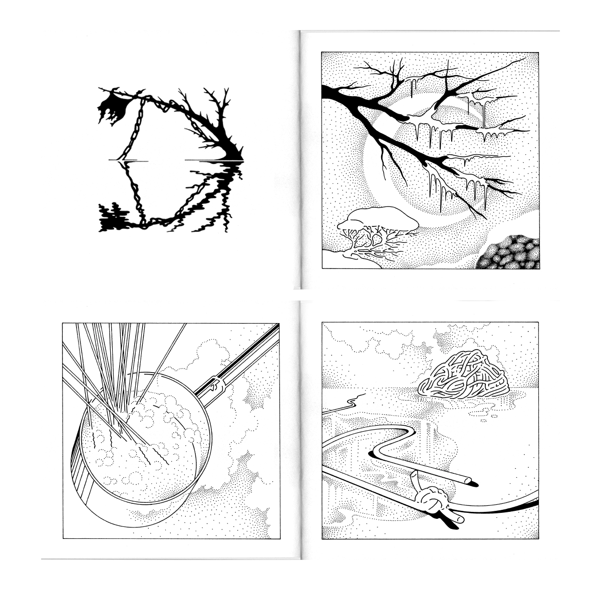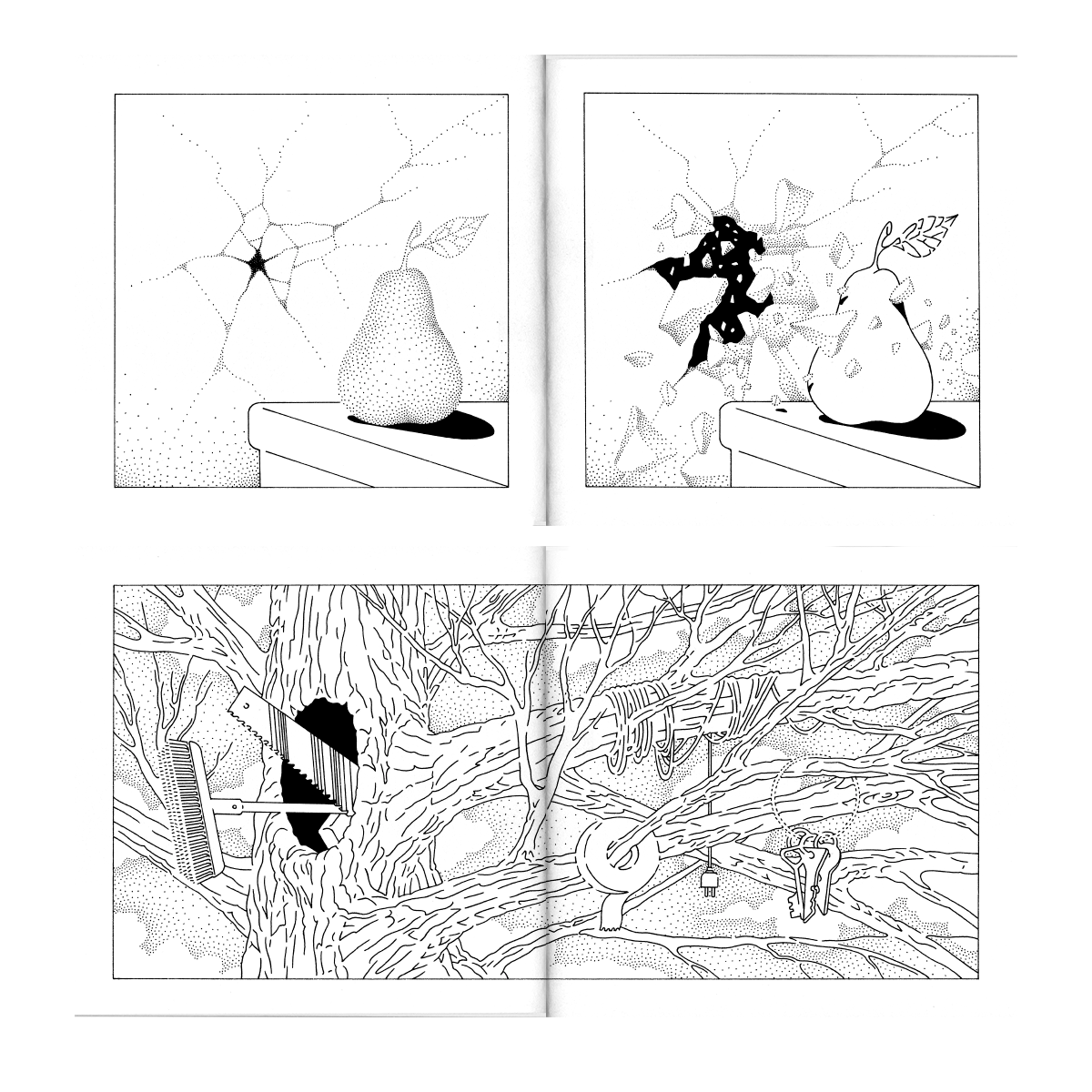 Les dessins de Jul Quanouai, ciselés à la pointe noire comme le seraient des gravures, sont placés sous le signe de la mutation, de l’inattendue prolifération des traits, des aplats et des points. Dans des cadres serrés et sous des angles inquiétants, ils captent à leur climax des scènes hallucinées dont la seule logique semble relever d’une contamination généralisée : contamination d’une forme par une fonction, d’une fonction par une surface, d’une surface par une dynamique… Dans cet univers fou où le mouvement se délire en des scènes brutalement figées par un flash de lumière crue, les identités se délitent et se mêlent. Rien, jamais, n’est à sa place, et de place il ne reste presque rien.